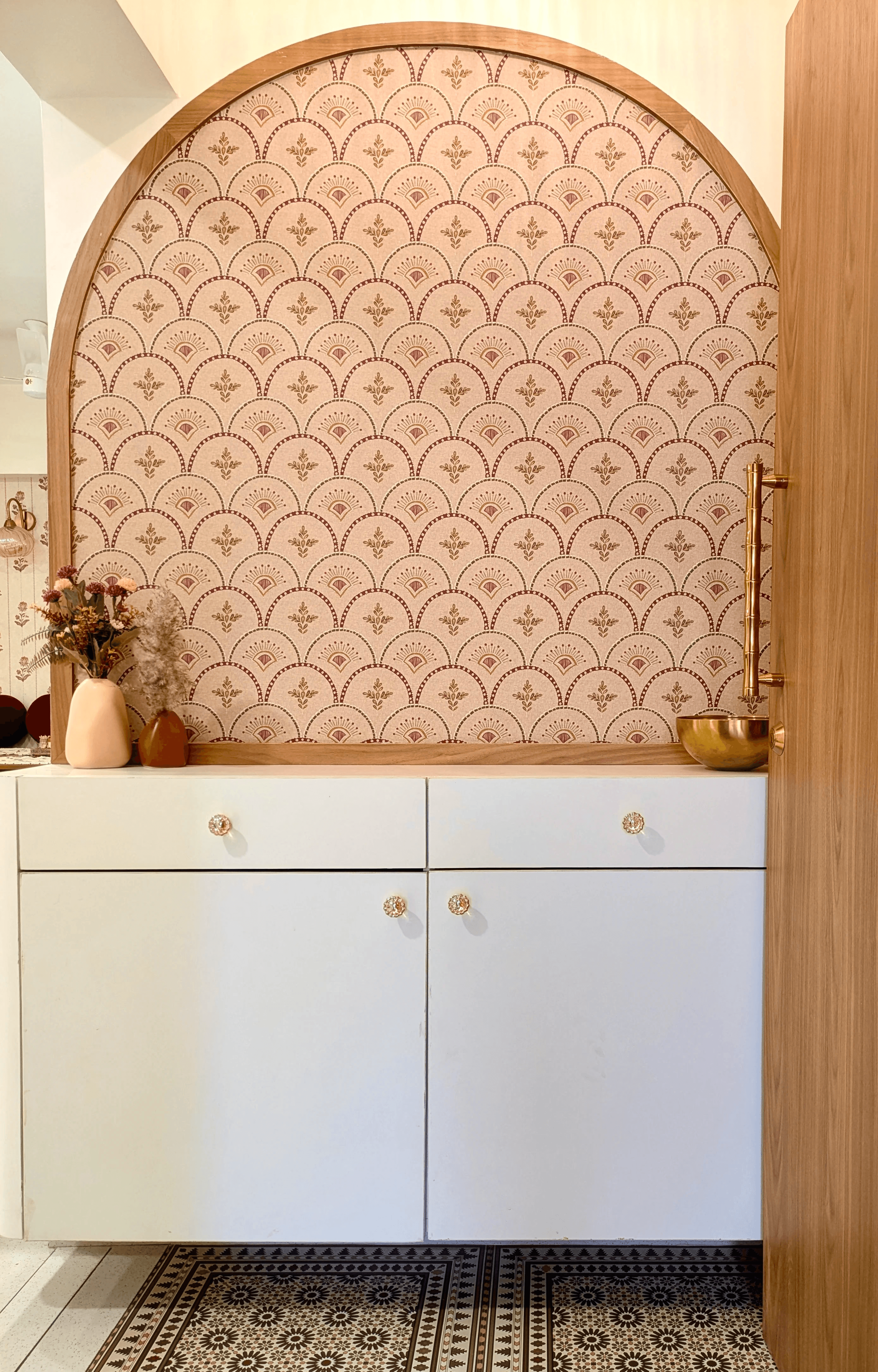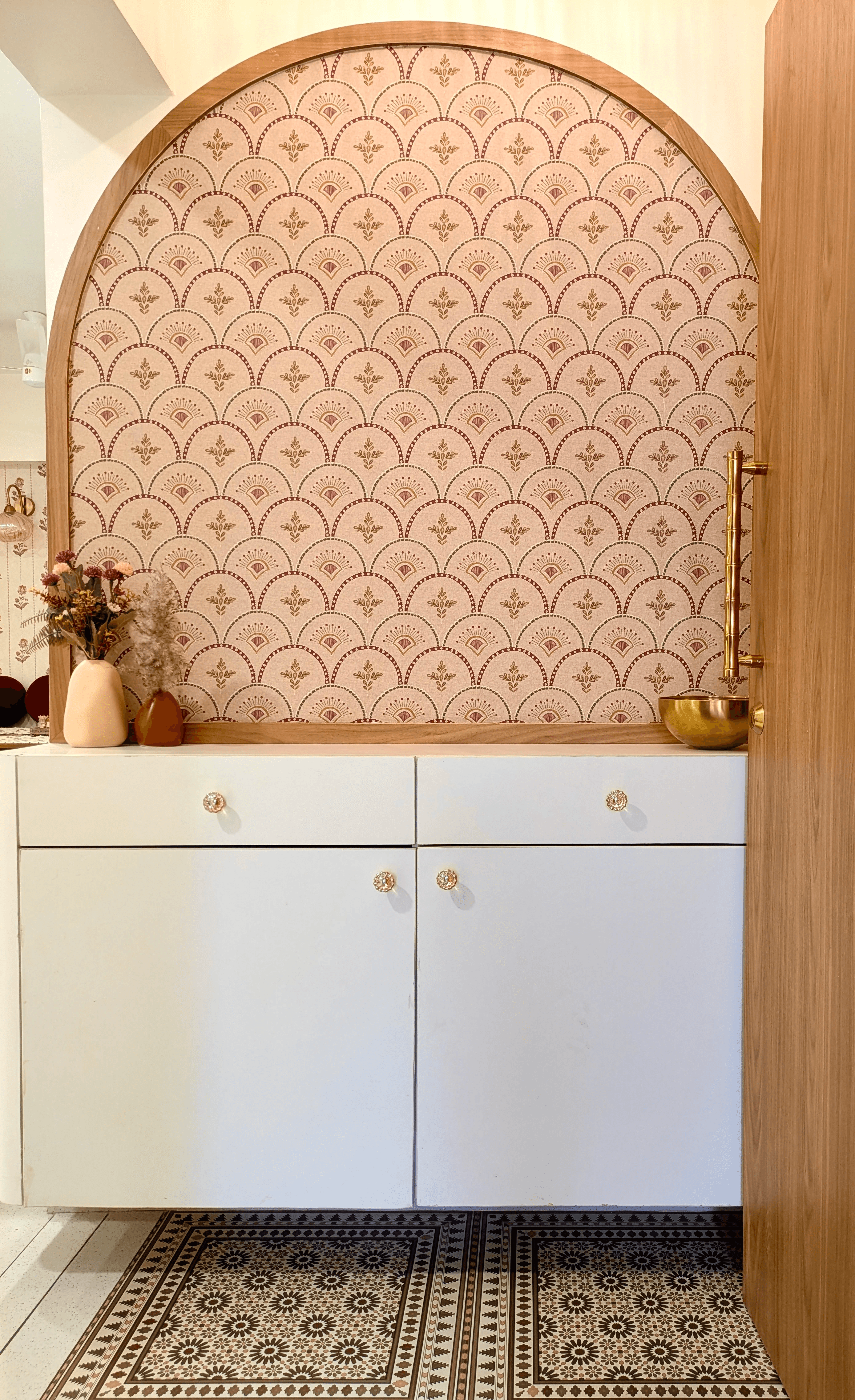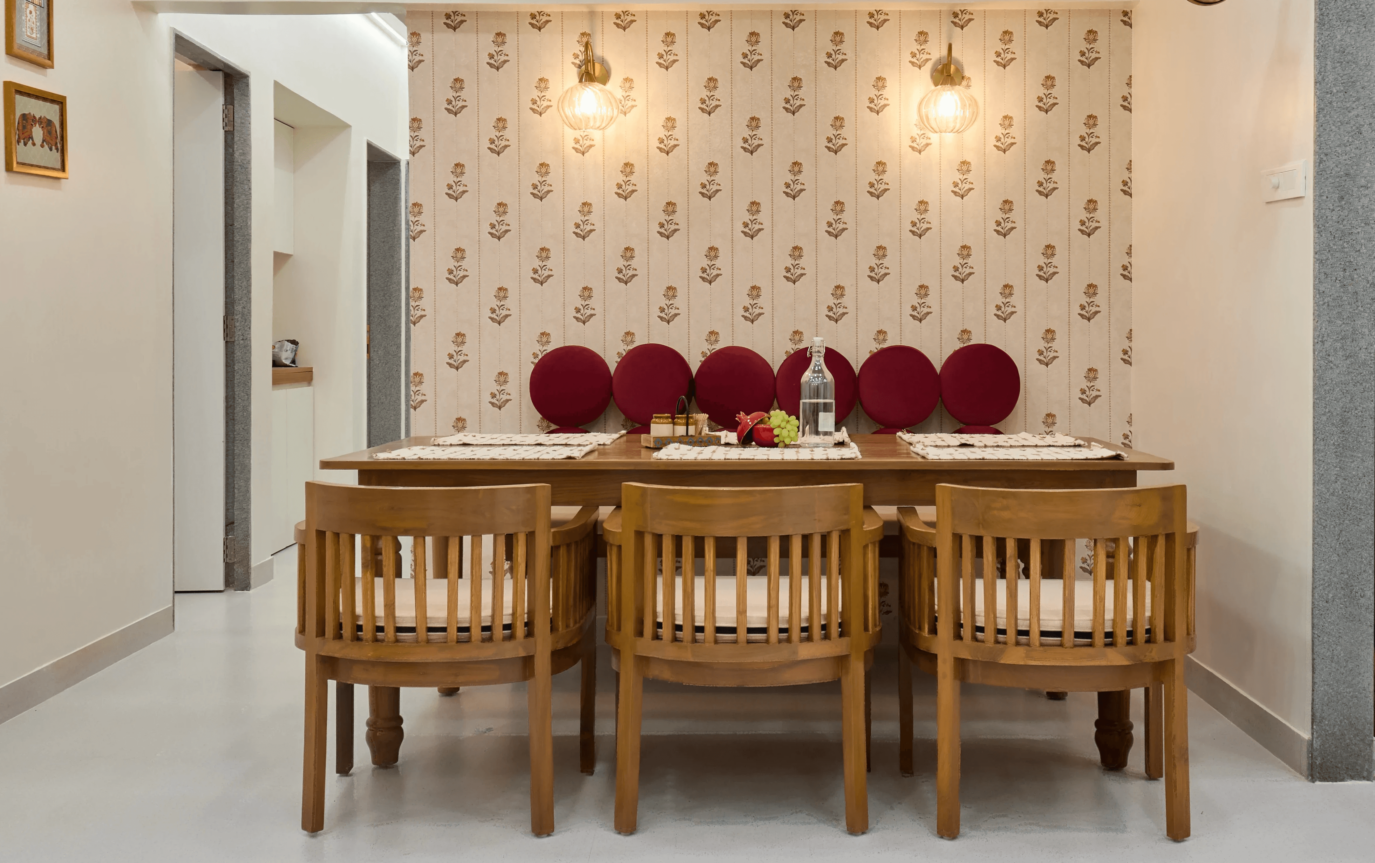 The living room seamlessly flows into the dining area which brings in the traditional twist to this room. The stunning handcrafted wooden table is accompanied with custom designed chairs and bench with a unique back, designed to complement the traditional wallpaper in the dining area.