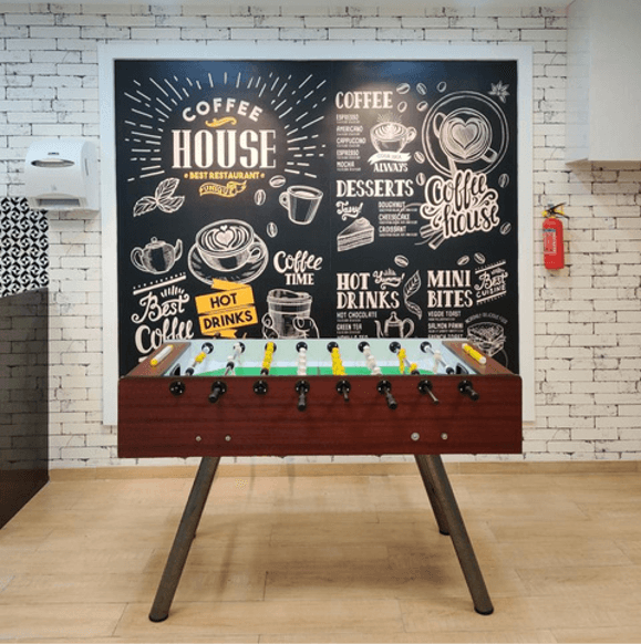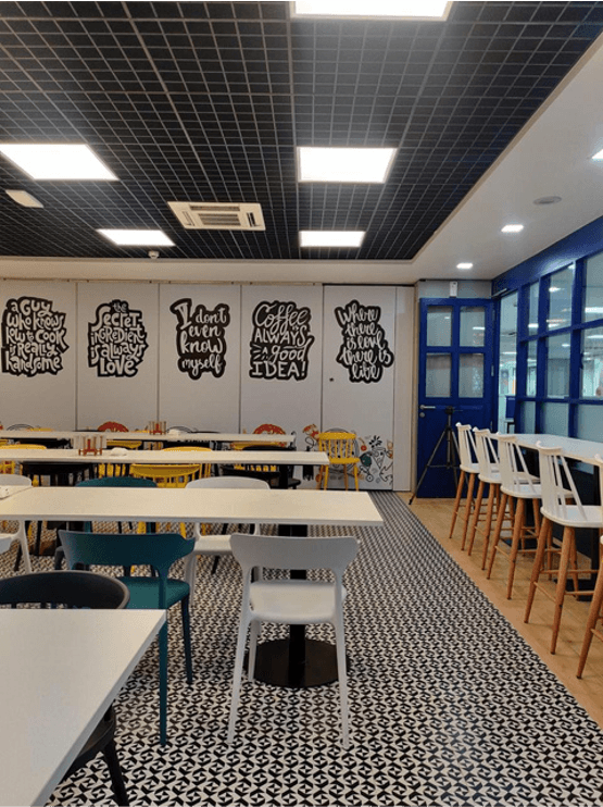 The design embraces contemporary elements like high-gloss marble floors and minimalist white walls, reinterpreting them in a striking way. Bold architectural features, such as the textured wall panels and the slatted, illuminated ceilings, evoke a sense of refined structure, adding depth and a distinctly modern character to the space. These clean-lined details are paired with pops of primary colors (blue, yellow, and black) and geometric patterns in the communal areas, striking a balance between corporate heritage and lively design.