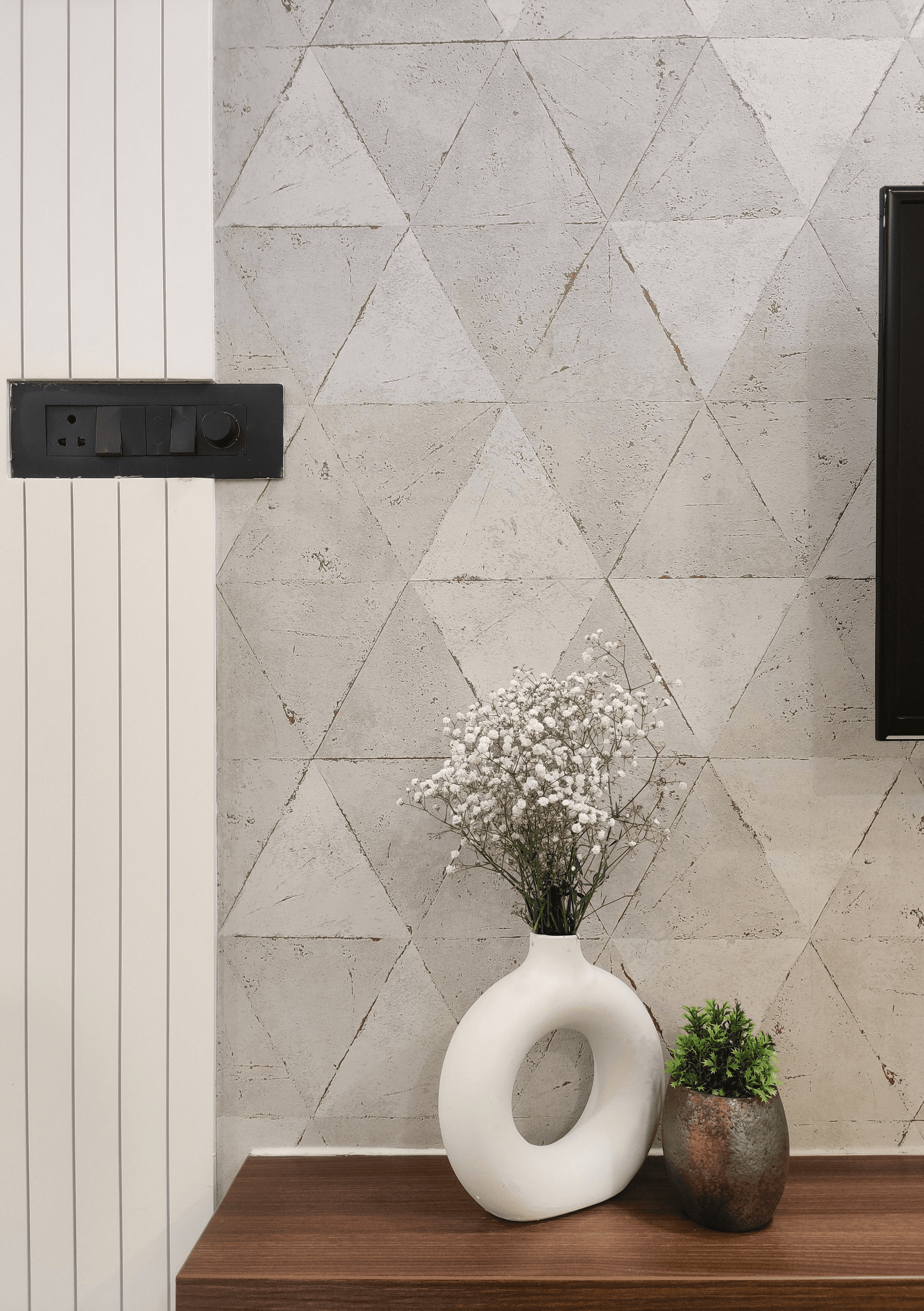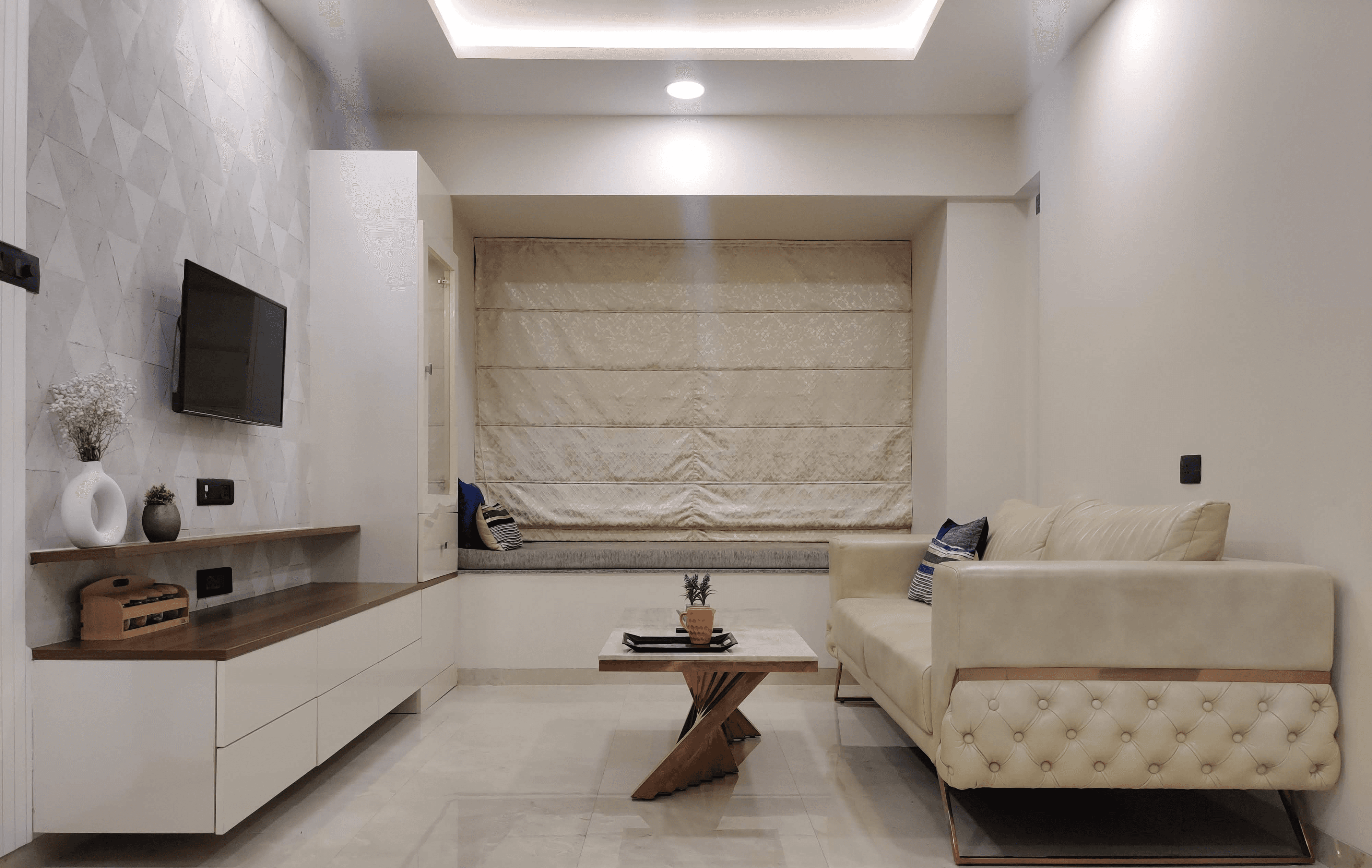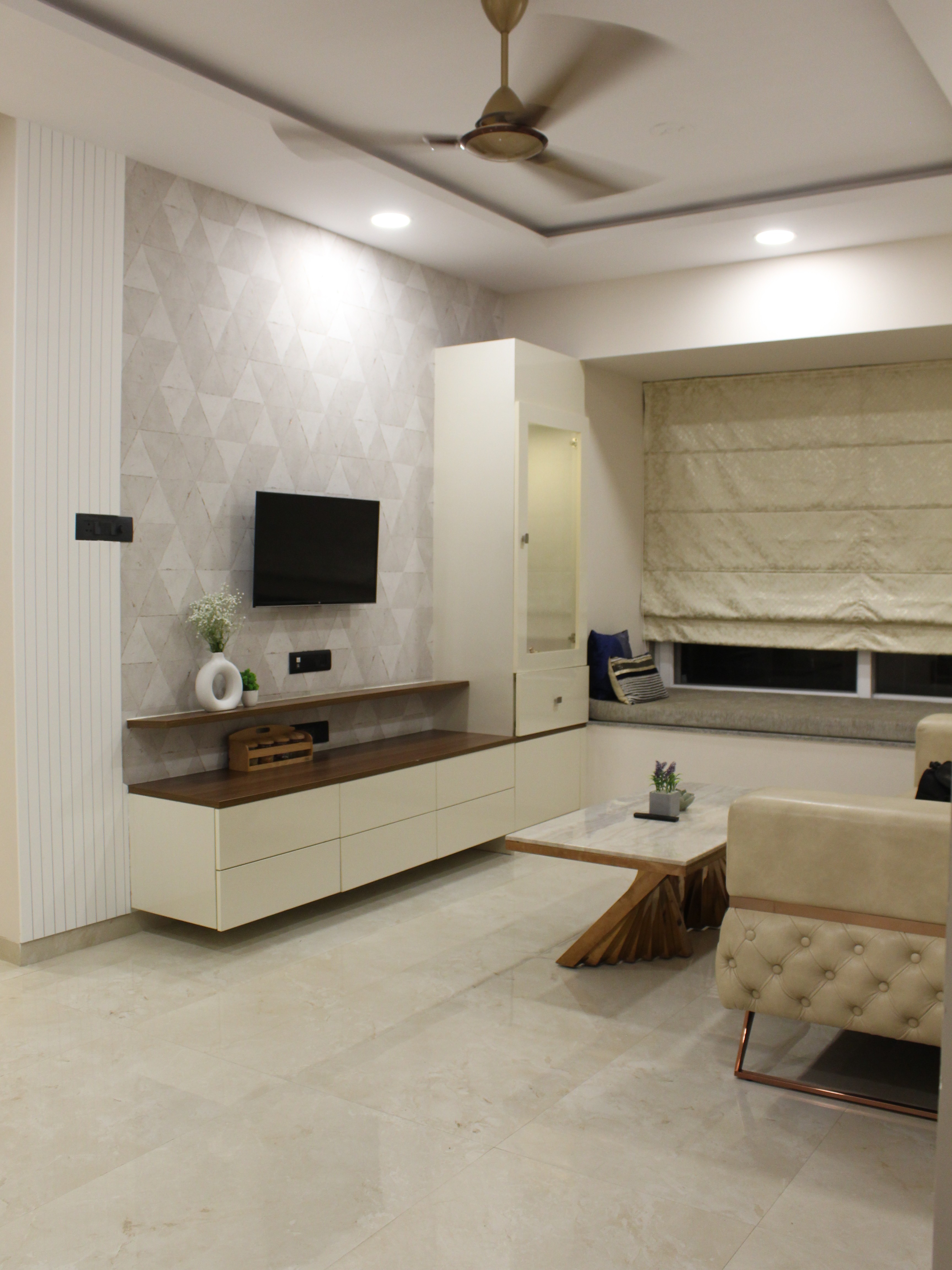 As you step into the living room, a sense of quiet elegance unfolds. The space is defined by a sleek beige sofa with tufted detailing, a sculptural wooden coffee table, and a minimal TV unit finished with warm walnut tones. The accent wall with geometric patterns adds visual depth, while the bay window seating makes for a cozy retreat that doubles as a reading corner.