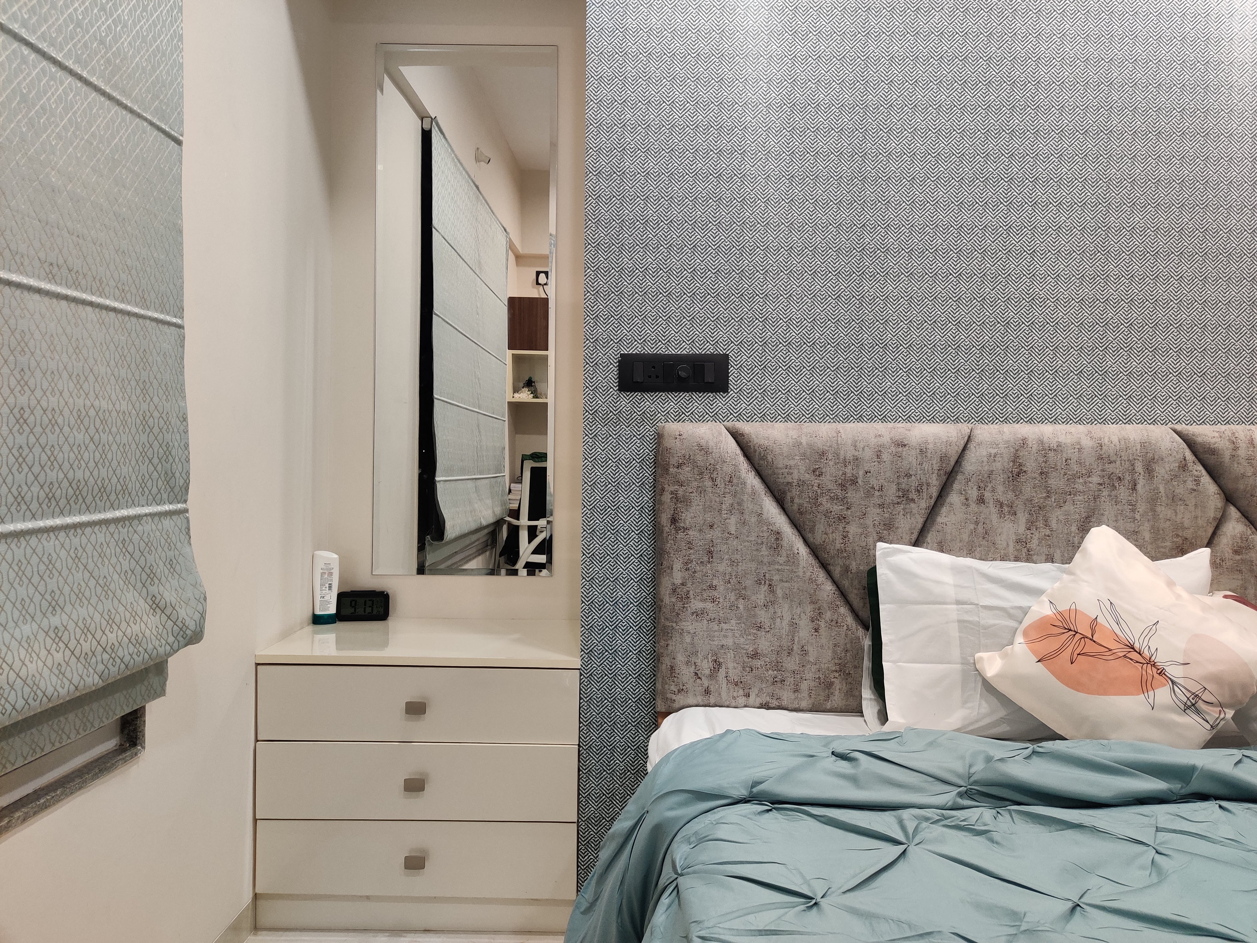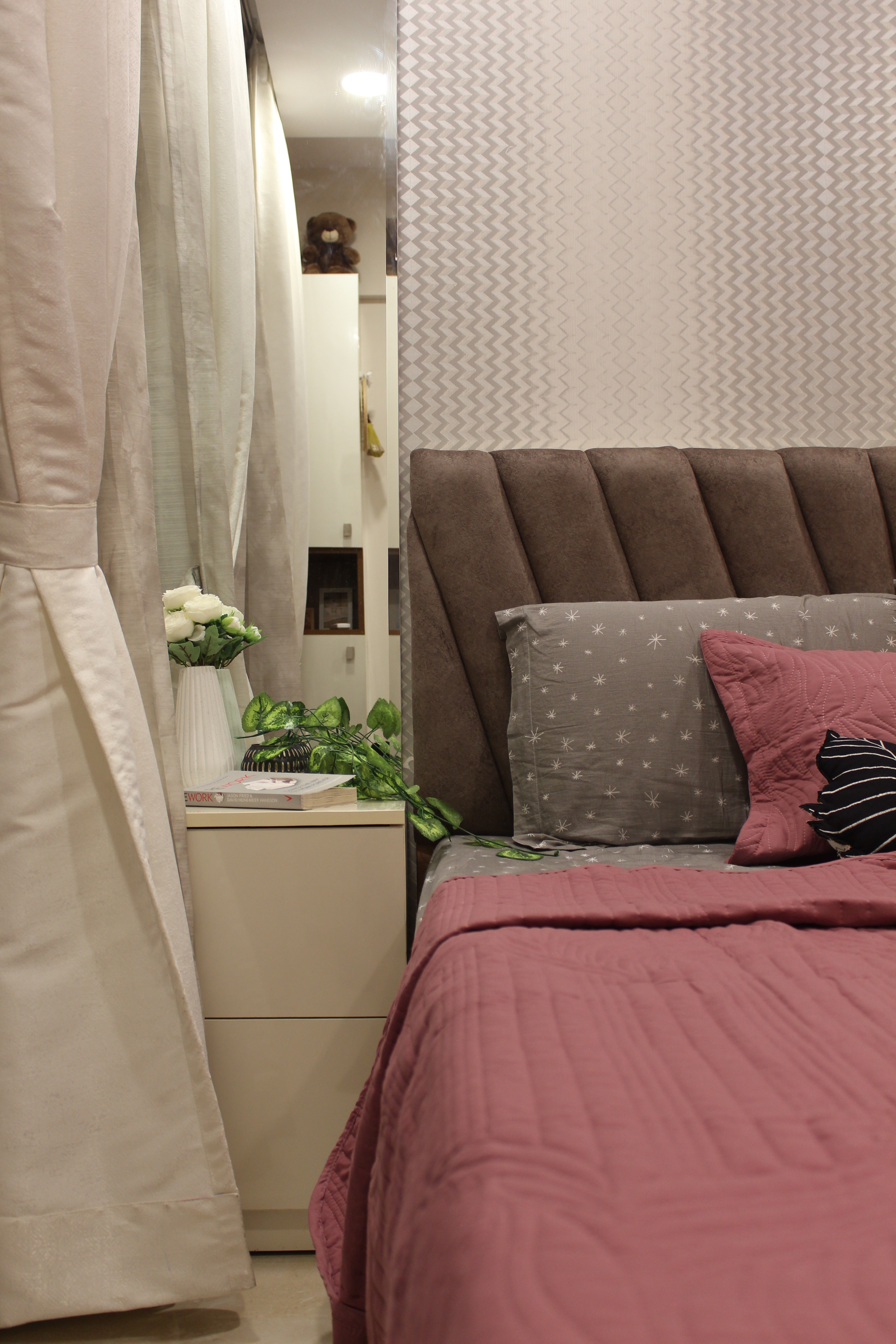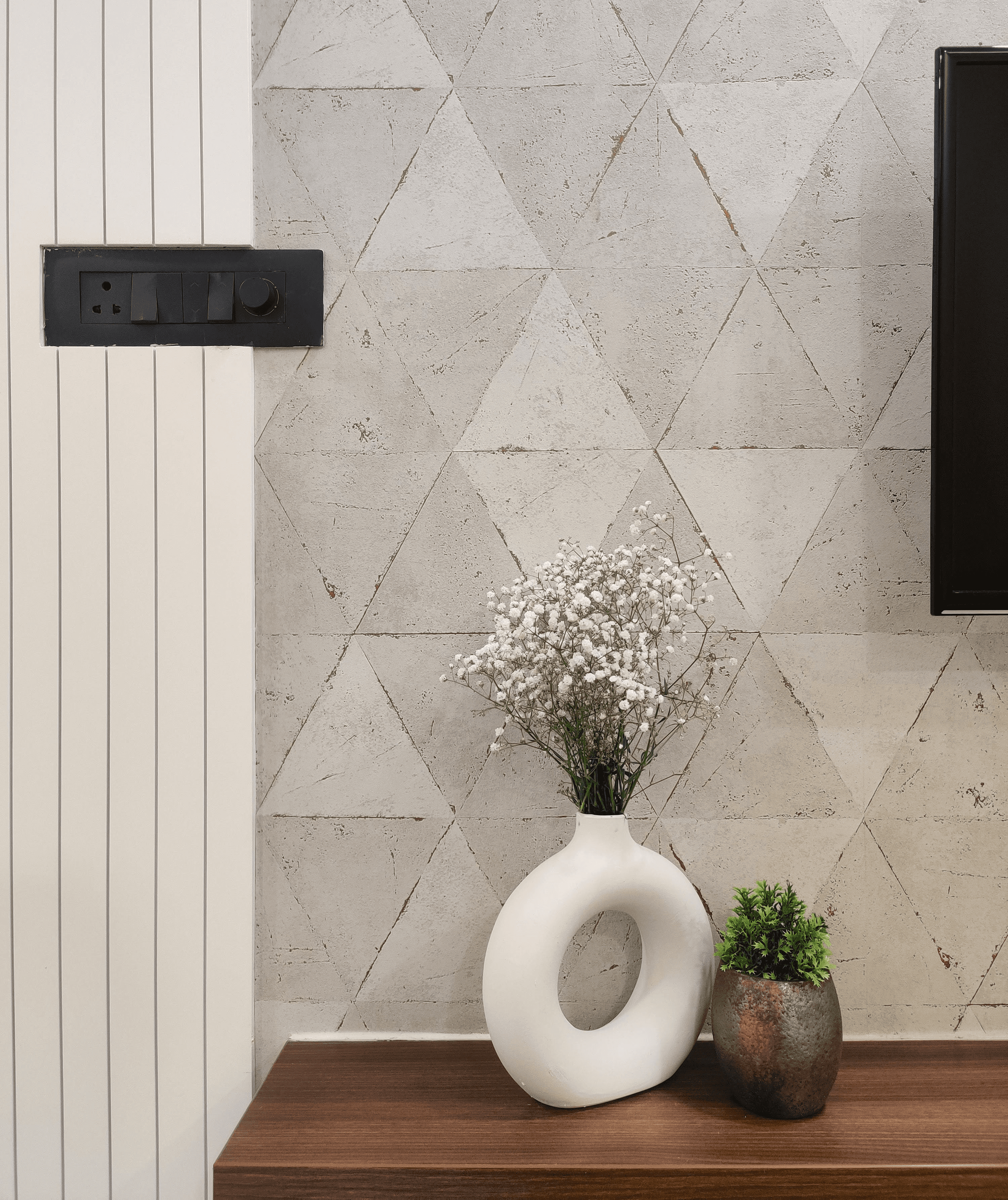 As you step into the living room, a sense of quiet elegance unfolds. The space is defined by a sleek beige sofa with tufted detailing, a sculptural wooden coffee table, and a minimal TV unit finished with warm walnut tones. The accent wall with geometric patterns adds visual depth, while the bay window seating makes for a cozy retreat that doubles as a reading corner.