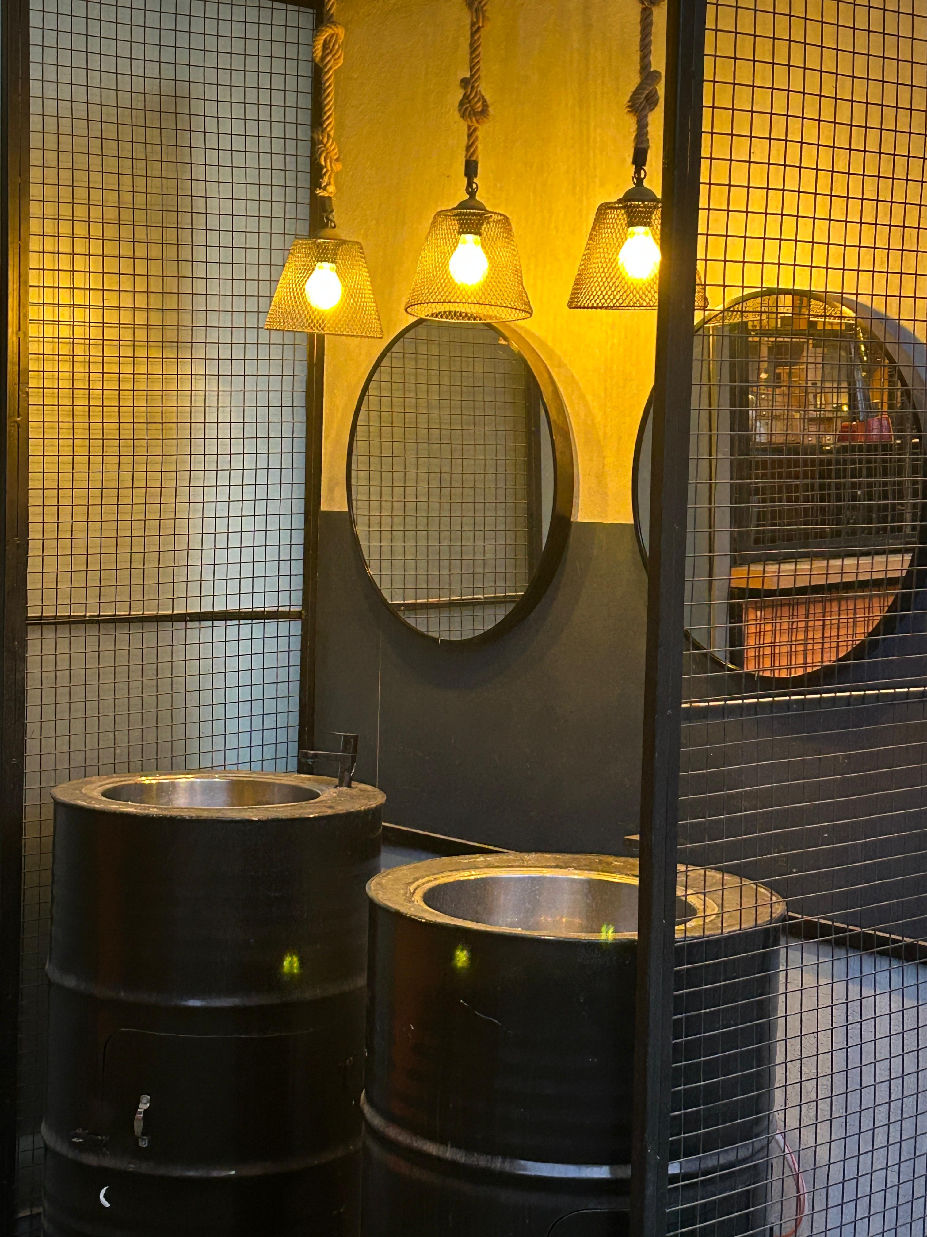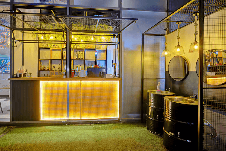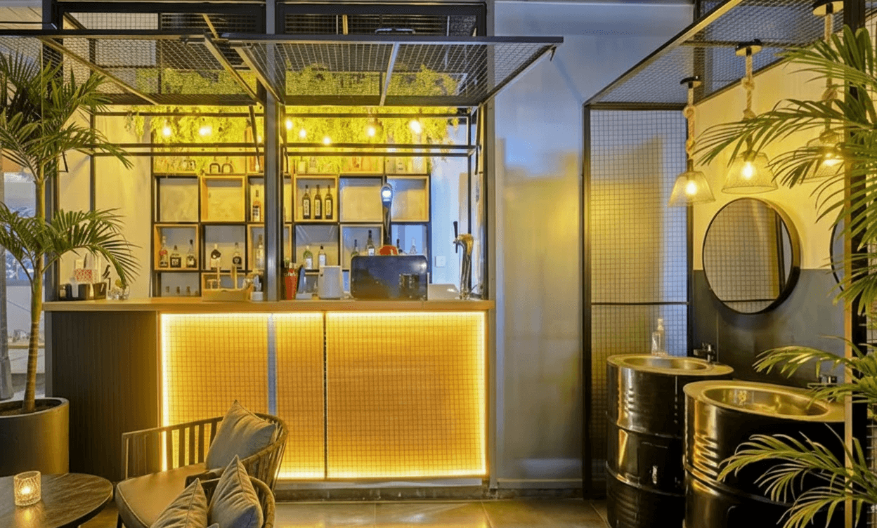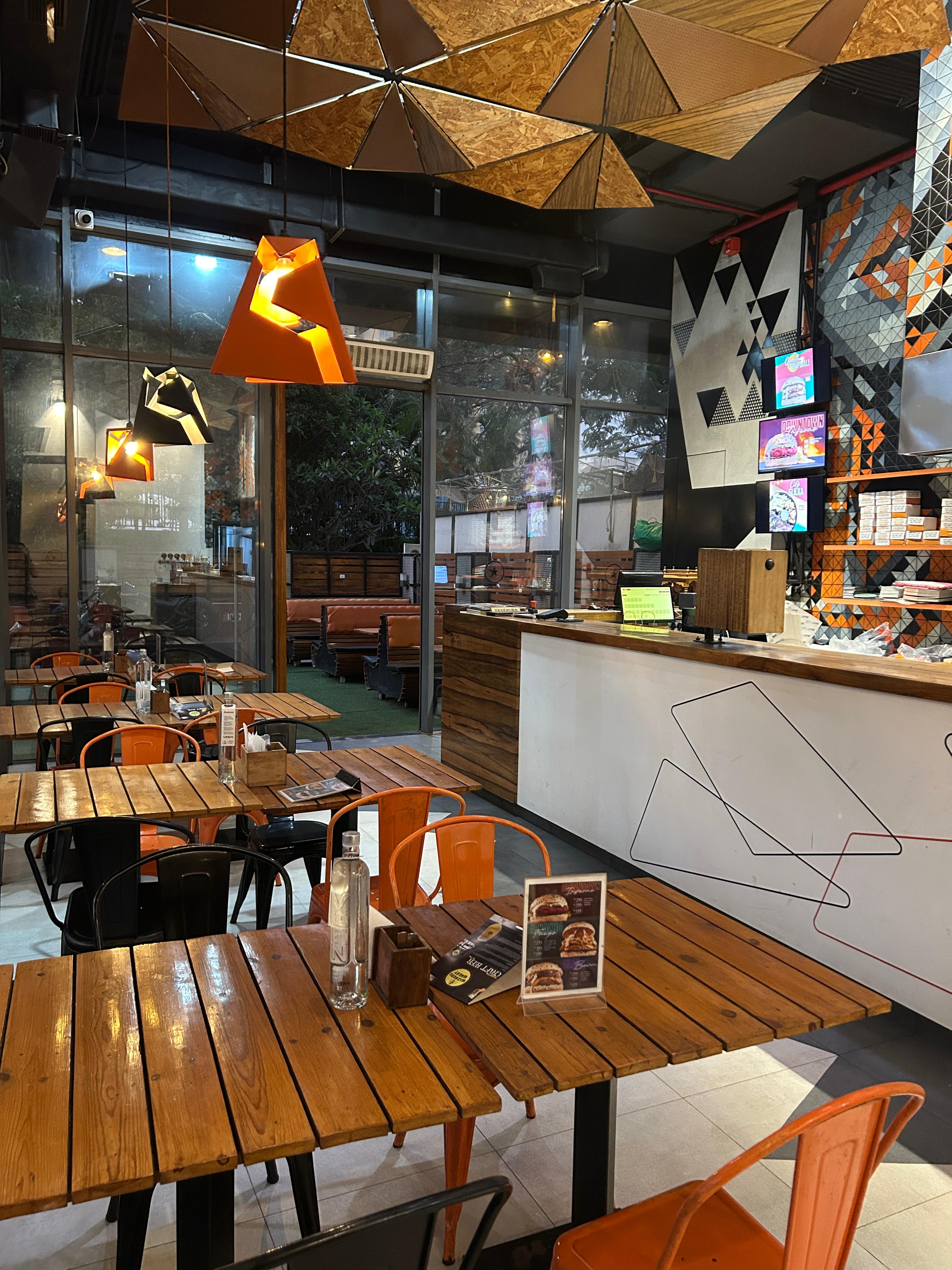 The interiors celebrate an eclectic mix of industrial aesthetics and playful personality exposed brick walls, graphic art, and pops of bright color come together to create a space that feels unapologetically edgy yet inviting. The use of raw materials like concrete, metal, and wood grounds the design, while quirky signage, bold typography, and dynamic lighting infuse it with character and movement.